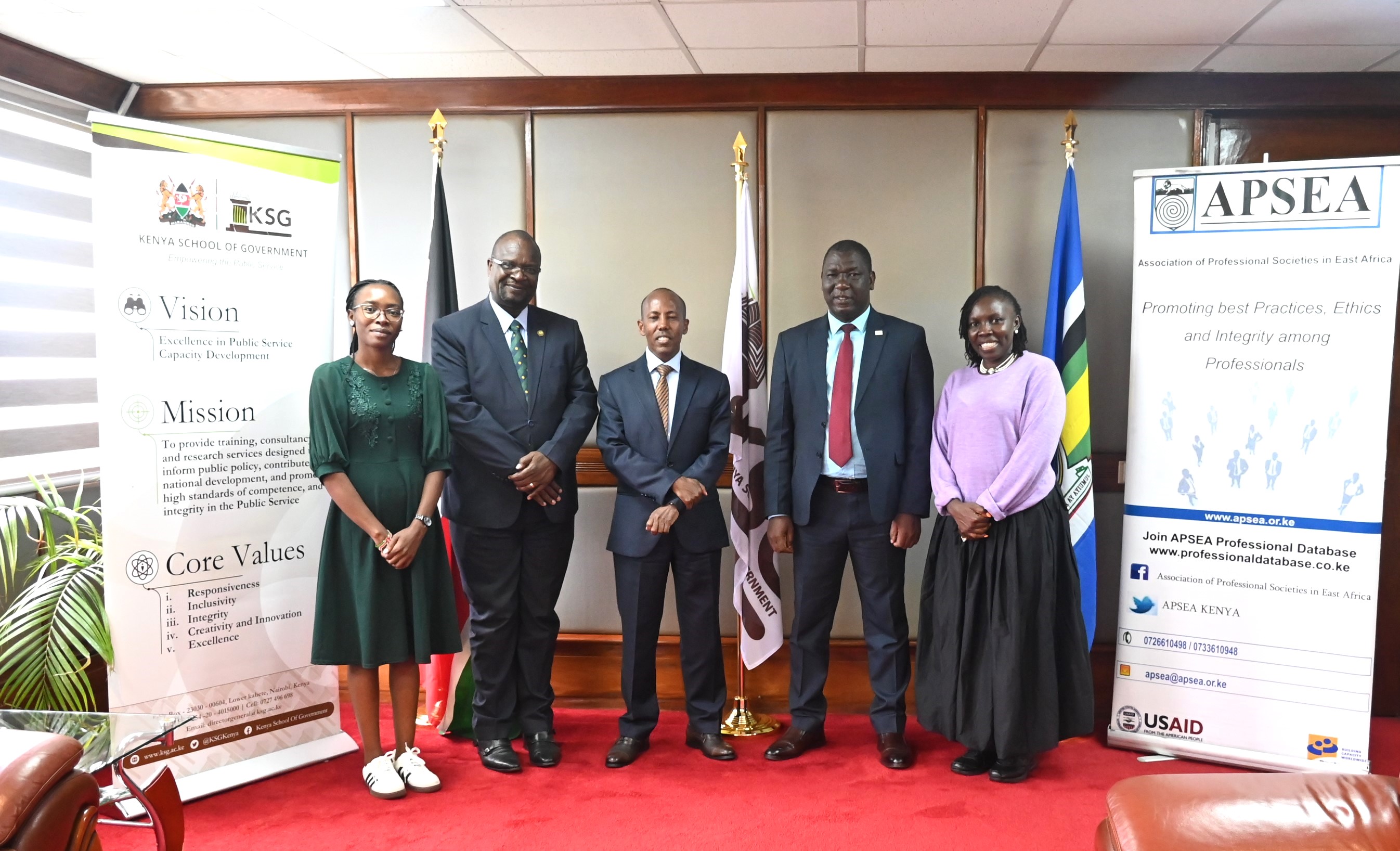 "Commissioner Leonid Ashindu led the APSEA delegation in a strategic meeting with Director General of the Kenya School of Government (KSG), Prof. Nura Mohamed, Ph.D., EBS, to explore areas of collaboration aimed at strengthening professional development and leadership capacity within the public and private sectors.